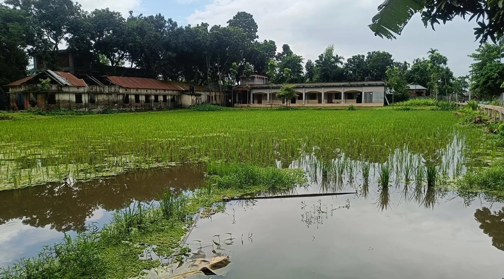 গাইবান্ধায় স্কুল শিক্ষার্থীদের খেলার মাঠ দখল করে ধান ও মাছের চাষ