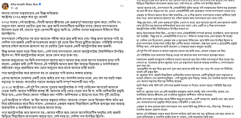 ঘটনাটিকে আরও নাড়িয়ে দিয়েছে একটি তথ্য সেটি হলো, মৃত্যুর মাত্র পাঁচ ঘণ্টা আগেও সামাজিক যোগাযোগমাধ্যমে সক্রিয় ছিলেন ইকরা। নিজের ফেসবুক অ্যাকাউন্টে একটি পোস্ট শেয়ার করেছিলেন তিনি। ঐ পোস্টে তিনি তার বোনের মাতৃত্বযাত্রার এক তিক্ত অভিজ্ঞতার কথা তুলে ধরেছিলেন। ইকরা মৃত্যুর কয়েক ঘণ্টা আগেও স্বাভাবিকভাবেই অনলাইনে উপস্থিতি ছিলেন, যা দেখে অনেকেই বিস্ময় প্রকাশ করছেন। কী কারণে এমন আত্মাহত্যা সিদ্ধান্ত তা নিয়ে তৈরি হয়েছে নানা প্রশ্ন। পাঠকের জন্য অভিনেতার স্ত্রীর শেষ পোস্টটি হুবহু তুলে ধরা হলো।